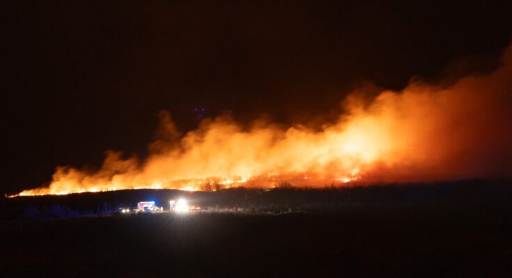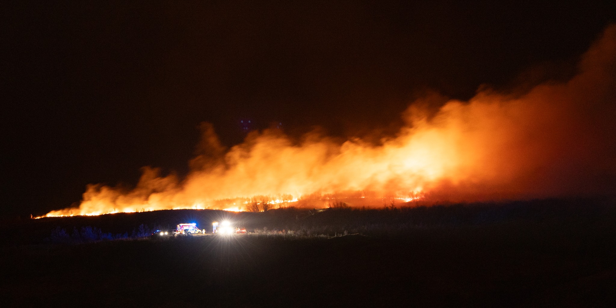 Vinnuvélar eru nú að tryggja svæðið. „Við fórum með haugsugu af vatni og jarðvegstætara til að rífa upp og koma í veg fyrir að eldur komi upp út frá glóð“, sagði Henning.