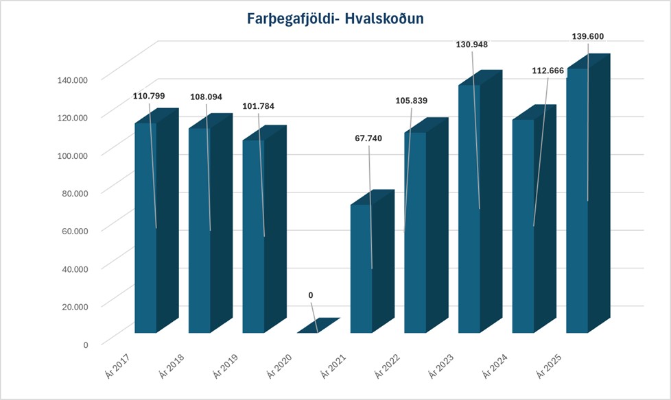 Fjöldi gesta í hvalaskoðunarferðir á þessu ári var sá mesti frá því byrjað var að bjóða upp á ferðir frá Húsavík fyrir þremur áratugum. Alls fóru um 140 þúsund manns í hvalaskoðunarferðir frá Húsavík á árinu 2025, sem er um 24% aukning frá fyrra ári og veruleg aukning frá fyrri metum. Til samanburðar fóru um 131 þúsund farþegar í ferðir árið 2023. Á meðfylgjandi stöplariti sem birt var á vef Norðurþings má sjá þróun farþegafjölda frá árinu 2016, sem endurspeglar stöðugan vöxt í greininni, en á árinu 2025 buðu fjögur fyrirtæki upp á hvalaskoðunarferðir frá Húsavík.