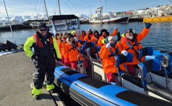 „Við buðum Enikő í þessa ferð til að gleðja hana á stóra afmælinu. Við erum 17 saman að ferðast,“ segir Kendi, skipuleggjandi ferðarinnar. „Enikő langaði að sjá norðurljósin og við sáum þau á fyrsta kvöldinu okkar hér á Húsavík. Náttúran hér í kring og Sjóböðin heilla okkur mikið og við höfum einnig heimsótt söfnin í bænum og erum að njóta dvalarinnar hér vel.“