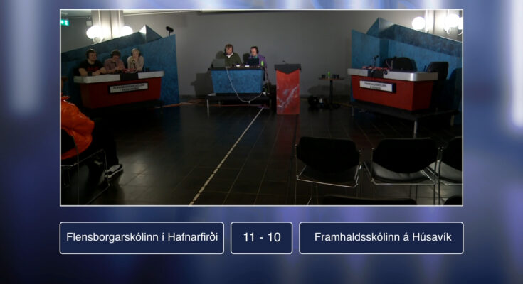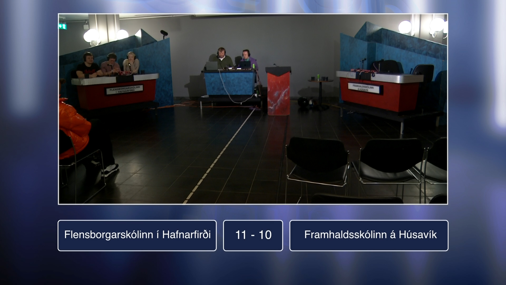Framhaldsskólinn á Húsavík leiddi með 6 stigum gegn 5 stigum Hafnfirðinga eftir hraðaspurningar. FHS fór einnig vel af stað í bjölluspurningum og höfðu þau gott tækifæri til að tryggja sér afgerandi forrystu þegar spurt var um leikarann sem fer með hlutverk Felix í þáttunum Felix & Klara, en þau svöruðu Georg Bjarnfreðarson, í stað Jón Gnarr.
