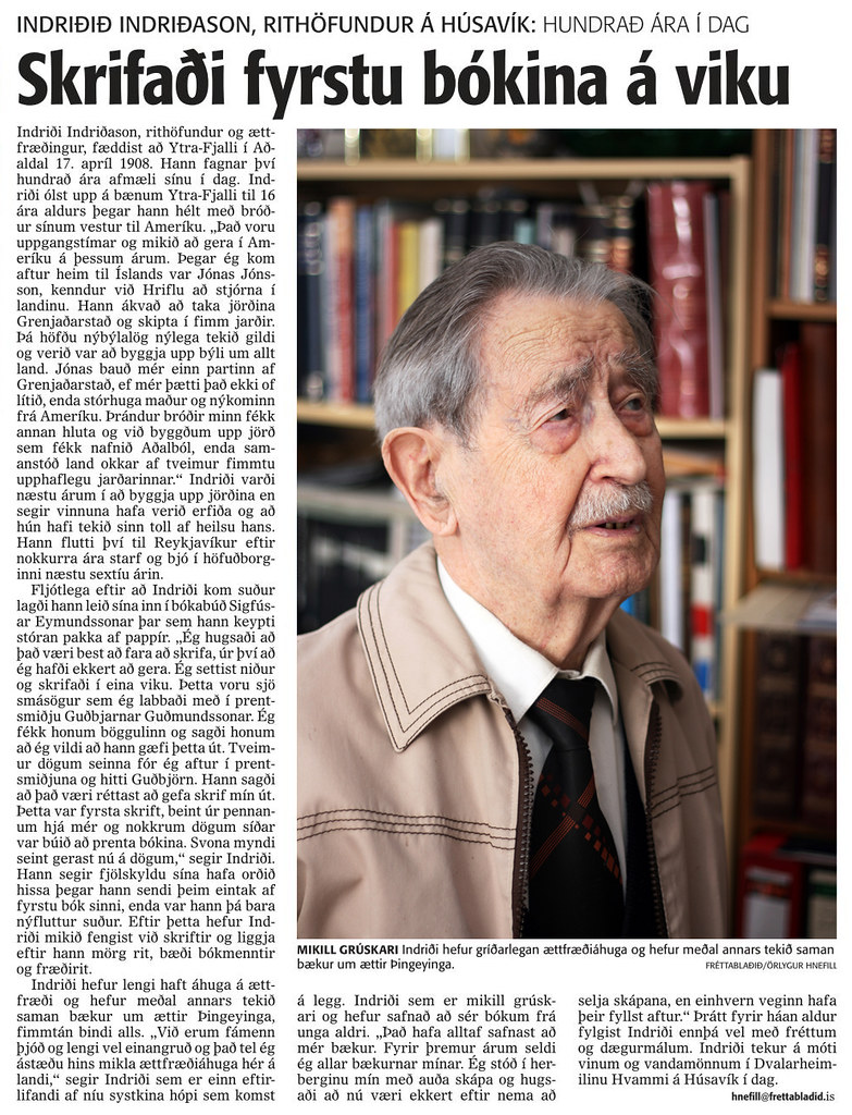 Þann 17. apríl árið 2008 varð Indriði Indriðason ættfræðingur og rithöfundur 100 ára. Af því tilefni tók Örlygur Hnefill meðfylgjandi viðtal og ljósmyndir sem birtust í Fréttablaðinu á aldar afmæli hans: