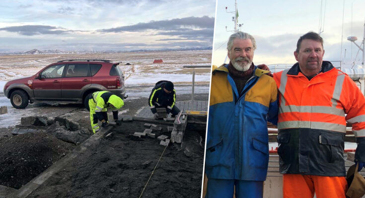 Strax í morgunsárið hélt fyrirtækið af stað í hellulögn í Mývatnssveit. „Við erum að fara í hellulögn í Mývatnssveit núna upp á morguninn, sem er í sjálfu sér frekar óvenjulegt á þessum tíma árs, í 330 metra hæð yfir sjávarmáli í janúarmánuði,“ segir hann. Það er því engan bilbug að finna á Guðmundi og hans öfluga starfsfólki. Á meðfylgjandi mynd má sjá tvo harða, þá Guðmund Vilhjálmsson og James Bond.