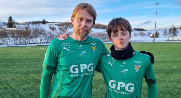 Það er ekki á hverjum degi sem frændur með tveggja áratuga aldursmun leiða saman sókn meistaraflokks, en á Húsavík í dag varð sú saga skrifuð. Það var stoltur faðir og afi, Aðalsteinn Árni Baldursson, sem sendi Húsavík.com meðfylgjandi mynd.