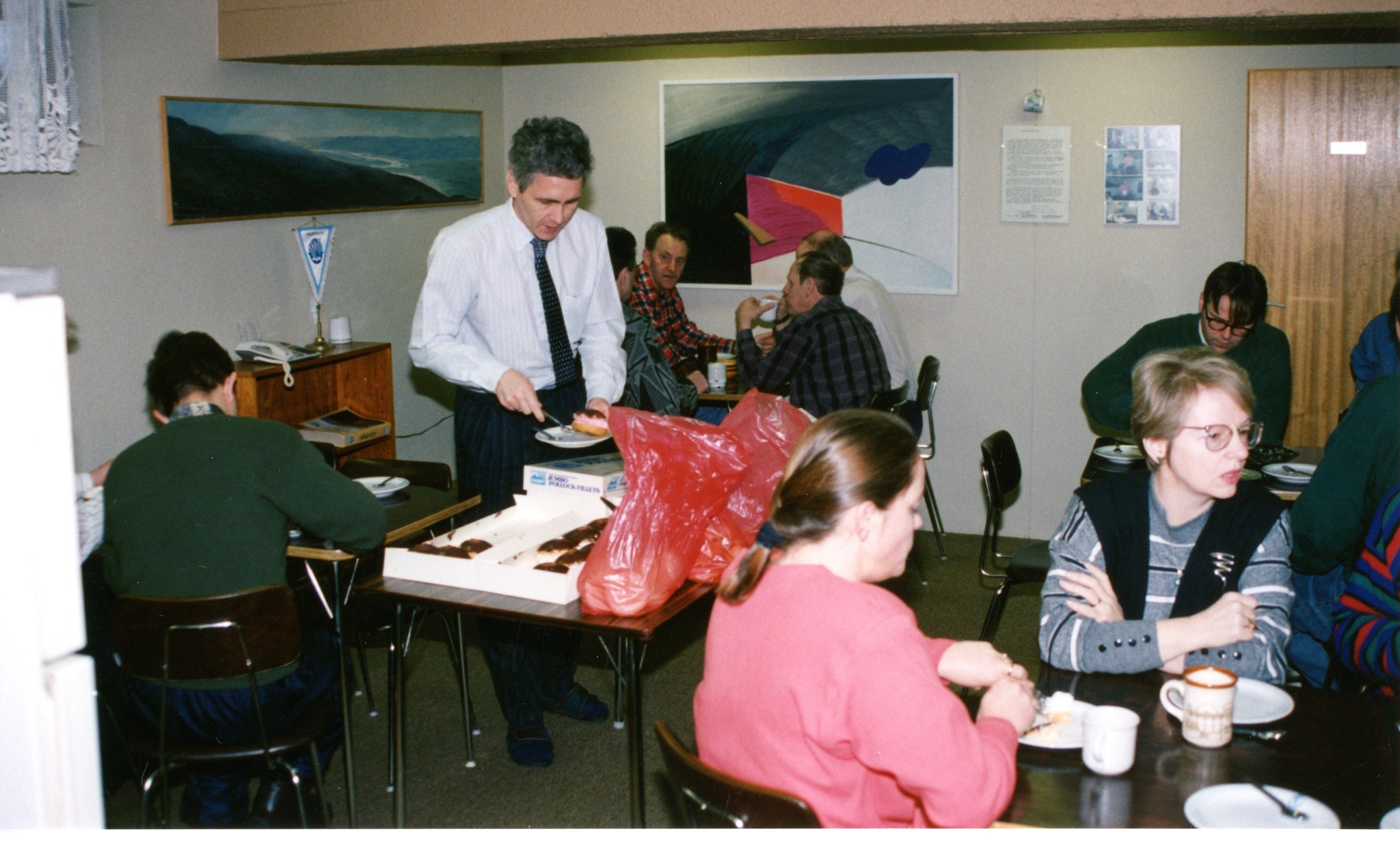 Í dag er bolludagurinn og af því tilefni birti Héraðsskjalasafn Þingeyinga nokkrar vel valdar myndir úr ljósmyndasafninu frá bolludegi á kaffistofunni á bæjarskrifstofunni á Húasvík árið 1989. Þó liðnir séu nærri fjórir áratugir má sjá kunnugleg andlit sem enn starfa í stjórnsýsluhúsi sveitarfélagsins, meðal annars þau Kidda Óskars og Ásu Gísla, að gæða sér á gómsætum bollum úr kössum sem merktir eru Fiskiðjusamlagi Húsavíkur, en væntanlega hefur samlagið útvegað bakaríinu handan götunnar stærri kassa á þessum annasama degi.
