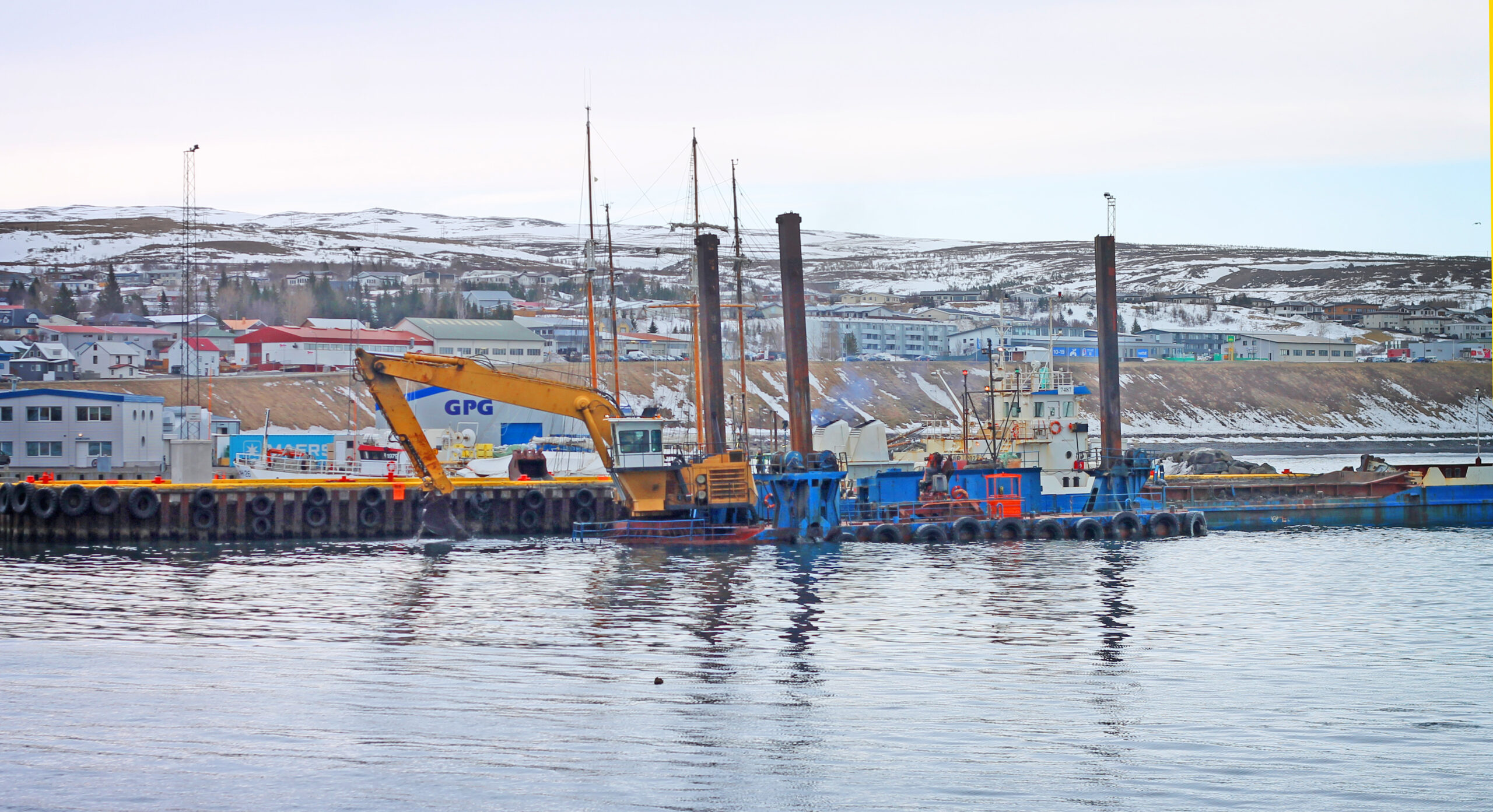 „Það er verið að grafa skurð í kringum þvergarðinn og út þar sem hann verður lengdur um 50 metra. Það er verið að undirbúa það að slá niður þil og hefja lokaframkvæmdir,“ segir Bergur.